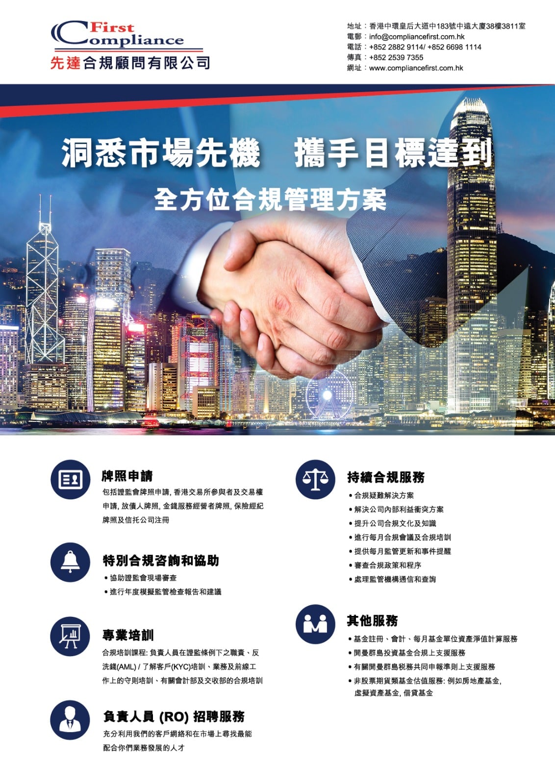 Compliance First Consulting Limited ("First") is a trusted compliance consultant that specializes in providing innovative compliance, operational risk management solutions and services in brokerage, corporate finance, asset management and other alternative investments in Hong Kong. We have been helping our clients manage compliance and risks to improve efficiency and effectiveness across their business.