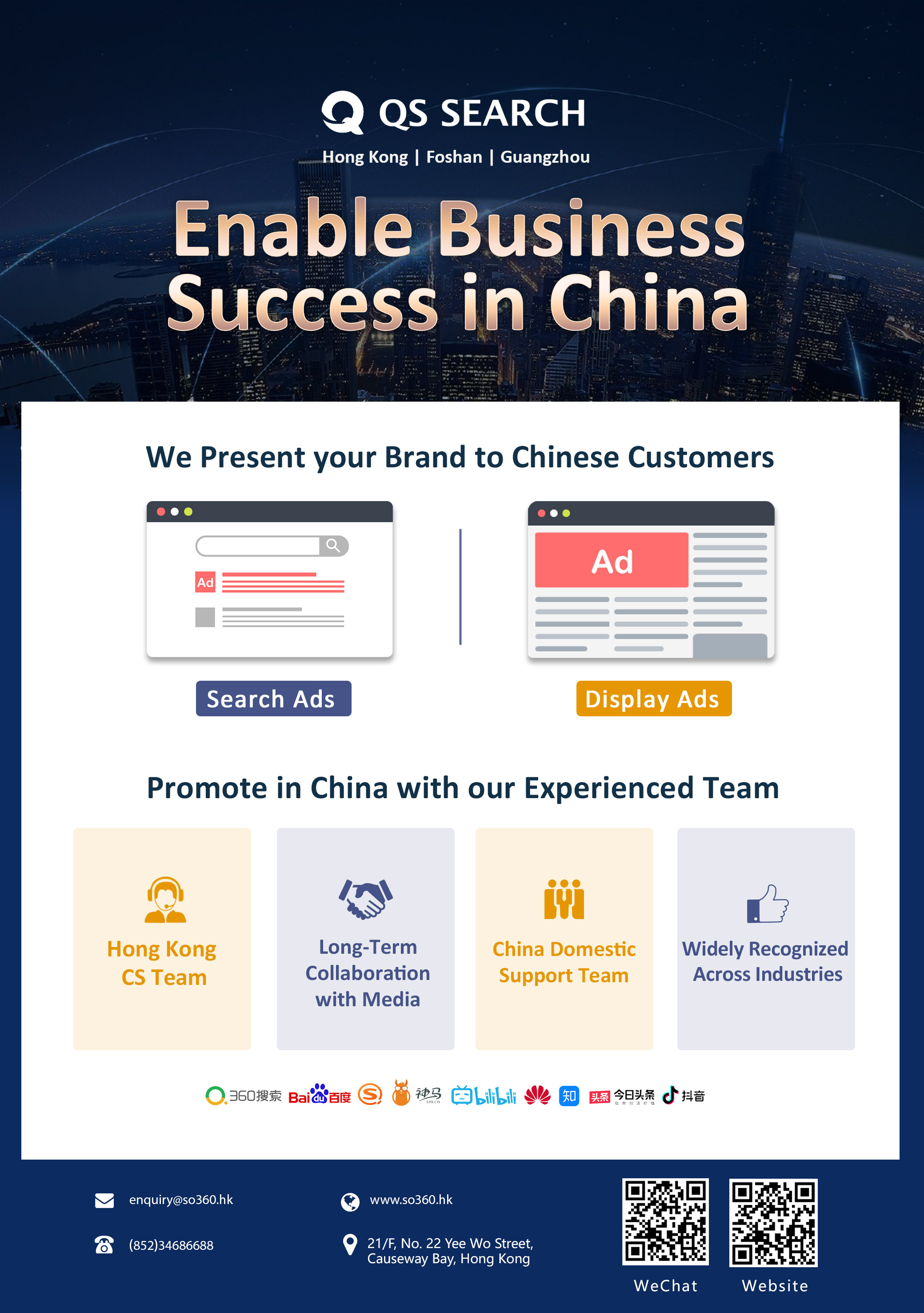 QS Search Limited is an integrated China media agency based in Hong Kong. Since our establishment in 2014, we are committed to providing tailor-made China media strategies, media planning and buying, which connect global brands with Chinese netizens.