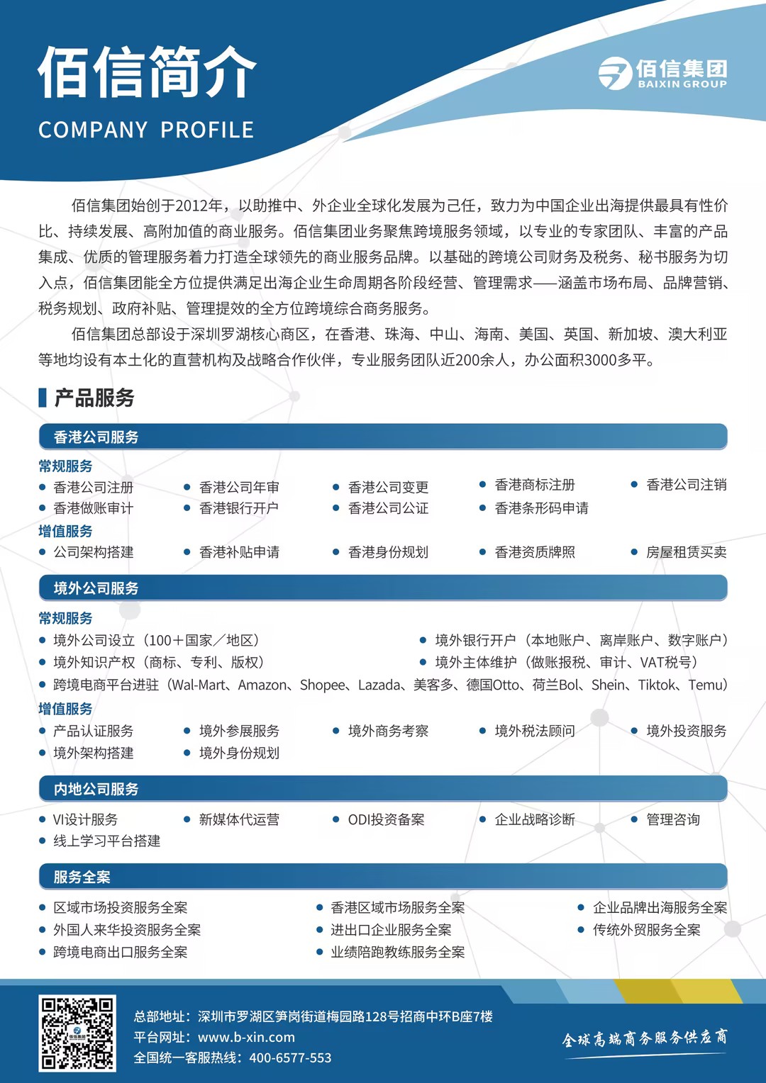 Bai Xin Group was founded in 2012, with the mission of promoting the global development of enterprises from the Mainland and worldwide companies, and is committed to providing the most cost-effective, sustainable development, and high value-added business services for companies going overseas.