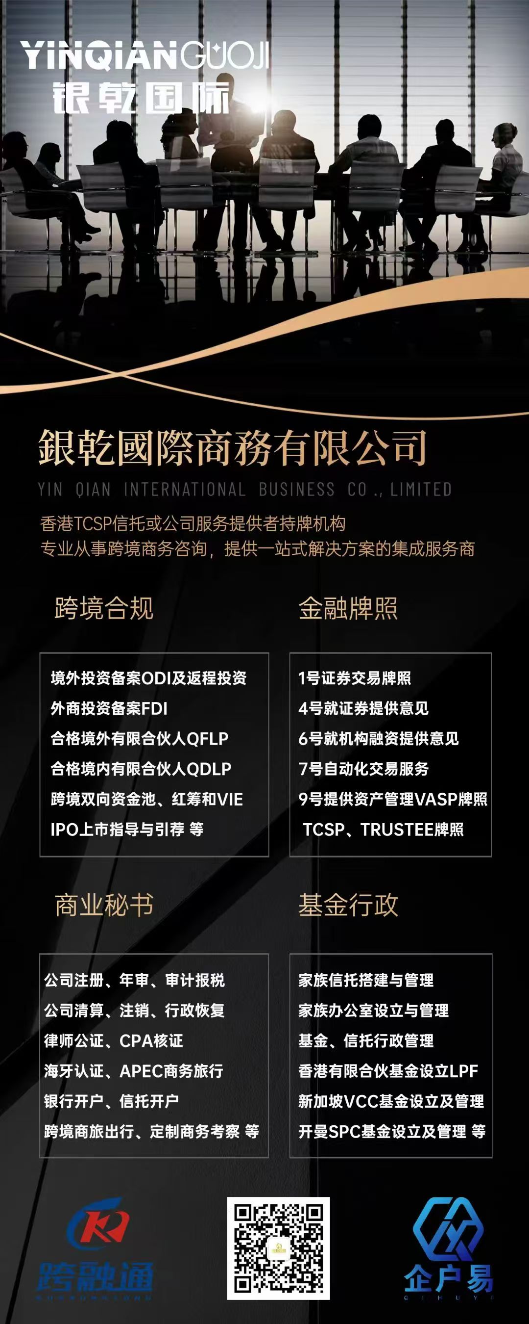 銀乾國際是一間專業提供跨境合規諮詢服務的顧問服務公司。自創立以來,團隊累積了豐富的成功經驗,為眾多企業完成了境外投資備案(ODI),涵蓋上市公司、國企、大型民企出海等各類案例。同時,以香港作為企業出海的橋頭堡,為金融企業出海提供各類牌照申請服務,具體類型包括證券及期貨事務監察委員會(下稱「證監會」)第一類(證券交易)、第四類(就證券提供意見)、第九類(提供資產管理)牌照、信託與公司服務牌照(TCSP)、受託人牌照(TRUSTEE)、金錢服務業牌照(MSO)以及香港有限合夥基金(LPF)等,並擁有相關成功經驗。除公司自有團隊外,銀乾國際亦會與中國內地、香港及其他境外金融行業的專業人士,以及律師、會計師、銀行家開展合作,為中國企業出海提供全方位的法律、財務、稅務管家式服務。