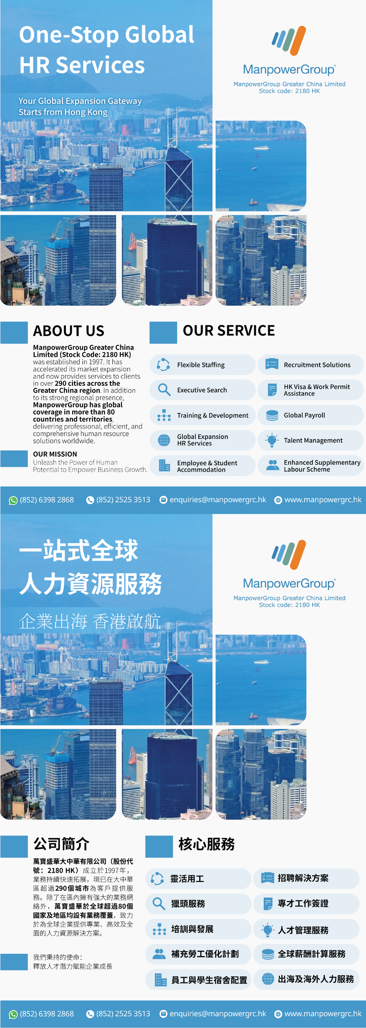 Unleash The Power of Human Potential. We are well recognized by clients and associations through our contemporary offerings of flexible staffing, head-hunting, recruitment process outsourcing, talent management, and training, Hong Kong visa and work permit assistance, and other integrated service solutions. As a testament to our commitment, we have received such honorable recognitions as “Asia-Pacific Human Resources Service Leading Enterprise”.